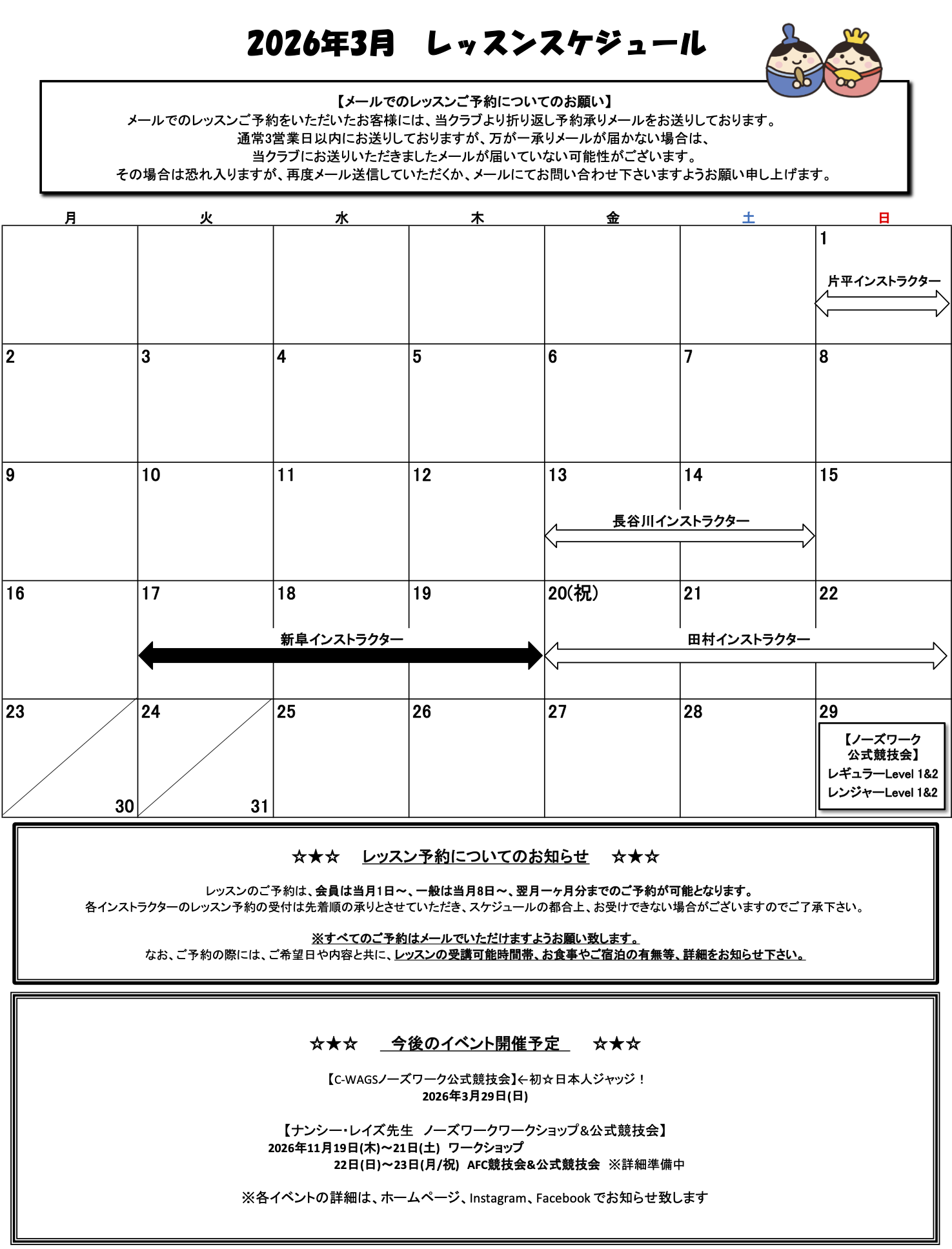 レッスンのご予約は、会員は当月1日〜、一般は当月8日〜、翌月一ヶ月分までのご予約が可能となります。